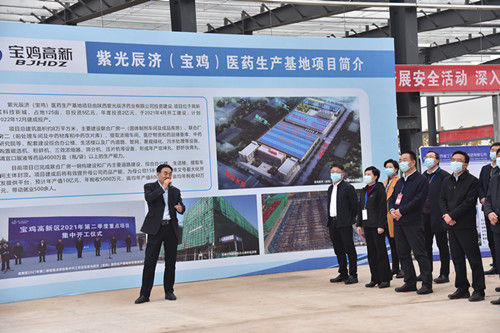 10月25日下午,宝鸡市委十二届十一次全会观摩团在宝鸡市委常委、政法委书记景耀平,市委常委、常务副市长刘荣贤,市委常委、副市长王宁岗带领三百多位与会领导顶着寒意和蒙蒙细雨到紫光辰济(宝鸡)医药生产基地项目建设现场观摩指导工作。公司总经理王睿成向前来观摩的领导们表示热烈欢迎和衷心感谢,感谢市委市政府对项目建设的关心和扶持。 “紫光辰济(宝鸡)医药生产基地”项目位于宝鸡高新区科技新城工业园区,是由星空(中国)投资建设的一座现代化医药联合体,项目总投资5亿元,占地125亩,项目总建筑面积约8万平方米,于2021年4月开工建设,主要建设综合楼、生活楼、联合厂房一、联合厂房二、提取车间、医疗物资应急储备库、中药研究院等,项目建成后预计年产值10亿元、年税收5000万元,带动就业500余人。 在观摩讲解中,公司总经理王睿成重点介绍了紫光辰济药业的发展历史沿革,据宝鸡工业志记载公司历史可追溯至1918年的达兴堂药店,走过了百年沧桑岁月,经过几代人的坚守和传承,以“悬壶济世、达兴民生”的初心和“药材必道地、配方必独特、提戥必齐目,炮制必如法、品质必上乘、待人必如亲”的“六必令”传训做为制药精神,辰济人已将其提炼升华为“放心药、辰济造”和“做好药,为人民”的核心价值理念,以优质的产品和真诚的服务取得了良好的经济效益和老百姓的口碑。 观摩活动中,领导们对公司展示的产品产生了极大的兴趣,尤其是独家品种“舒肝快胃丸”和“消积丸”,这两款产品是公司主打黄金单品,“舒肝快胃丸”主要功能是肝胃同治,解酒保肝功效显著;“消积丸”主治各种积症,对改善口气、便秘、减轻肚子负担和消除大肚腩作用明显。这两种都是公司独家产品,市场需求和市场前景巨大。观摩领导们对新厂建设和企业发展交口称赞,希望公司加快建设步伐,以新的发展态势早日造福三秦父老和广大消费者。