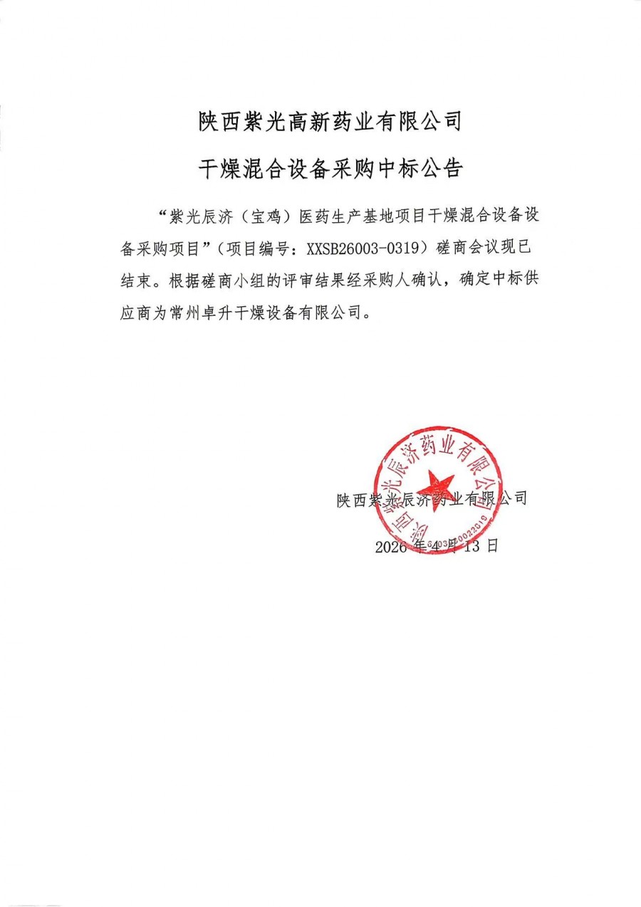 陕西紫光高新药业有限公司干燥混合设备采购中标公告