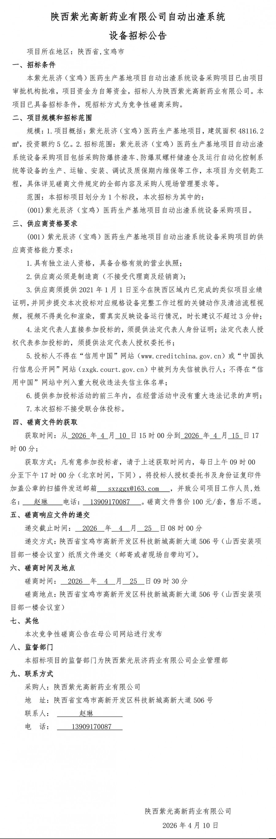 陕西紫光高新药业有限公司自动出渣系统设备招标公告