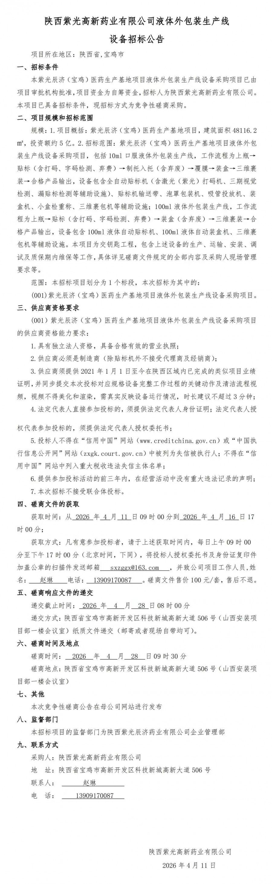 陕西紫光高新药业有限公司液体外包装生产线设备招标公告